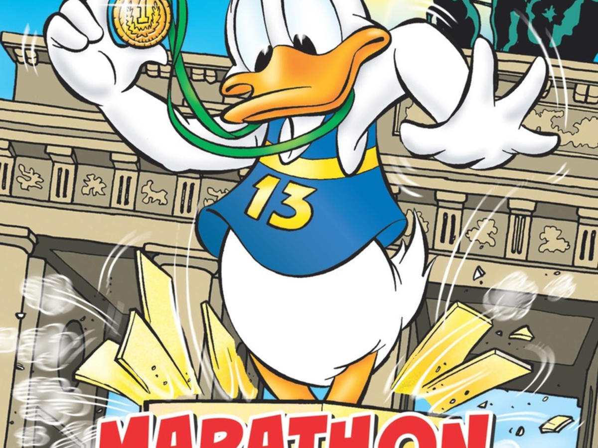 Und nicht nur auf dem Cover spielen die Sehenswürdigkeiten Berlins eine große Rolle, sondern auch in der exklusiven Titel-Story "Marathon in Berlin", in der Donald Duck, Gustav Gans und Amanal Petros mit Pech, Glück und Teamwork am BERLIN-MARATHON teilnehmen.