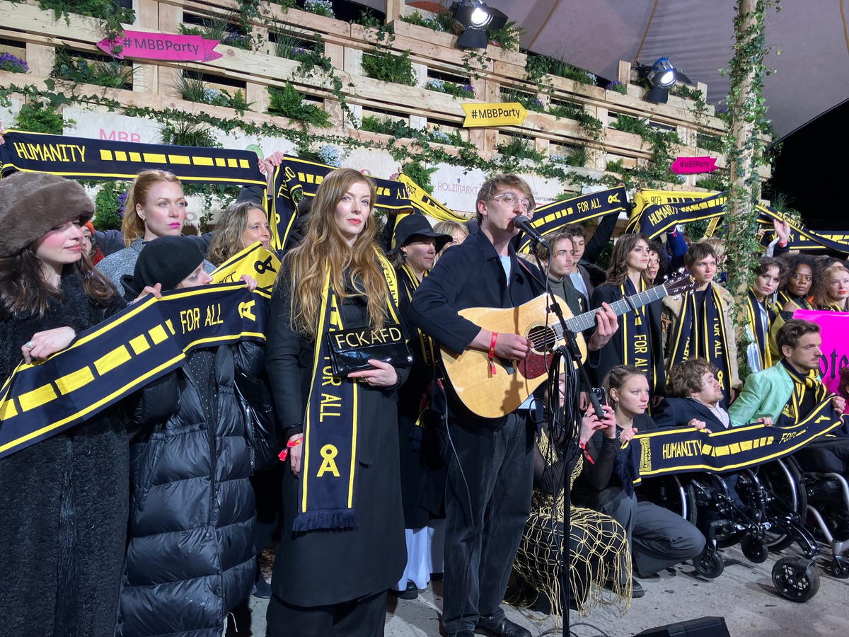 Bereits bei der Eröffnung der Berlinale am Donnerstag hatten die Schauspielerinnen Meret Becker und Anna Thalbach einen Schal mit der Aufschrift « Humanity for all» hochgehalten.
