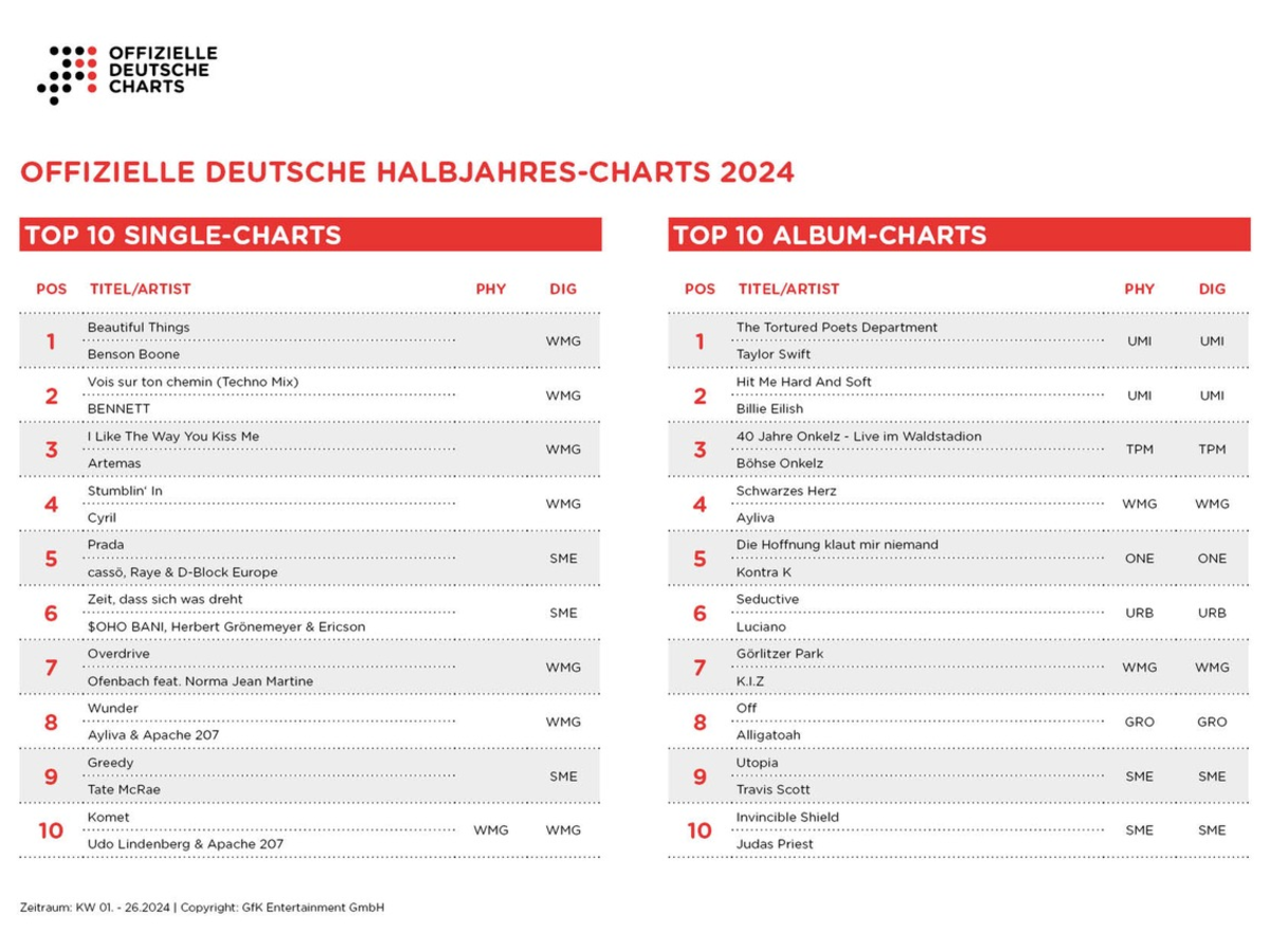 Die Offiziellen Deutschen Halbjahres-Charts wurden fĂŒr den Zeitraum der Wochen 01 bis 26 erstellt. Basis sind die Verkaufs- bzw. Nutzungsdaten von 2.800 HĂ€ndlern sĂ€mtlicher Absatzwege. Dazu zĂ€hlen der stationĂ€re Handel, E-Commerce-Anbieter, Download-Portale und Streaming-Plattformen.