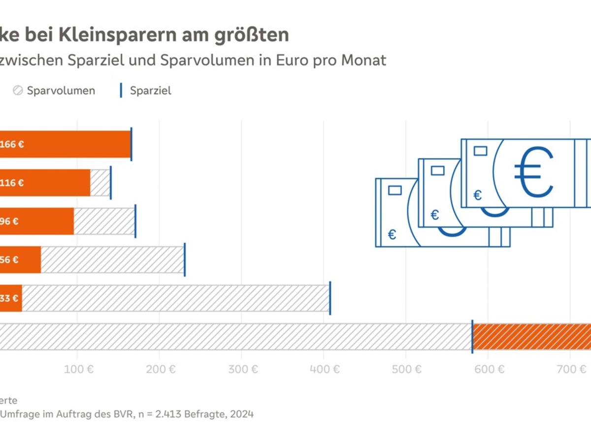 Die in der BVR-Umfrage ermittelten Sparlücken demonstrieren den Förderbedarf. Insgesamt verfehlt jeder zweite Bundesbürger die eigenen Sparziele um mindestens die Hälfte. Rund 20 Prozent der Bevölkerung legen monatlich nichts zurück, obwohl sie eine Sparnotwendigkeit von 166 Euro sehen. Zehn Prozent der Bundesbürger können monatlich 1 bis 49 Euro zurücklegen, hätten nach eigenen Angaben zur Erreichung ihrer Sparziele aber 141 Euro zurücklegen müssen. Sie verzeichnen damit eine durchschnittliche Sparlücke von 116 Euro. Relativ ausgedrückt sind das 80 Prozent zu wenig. Weitere knapp 20 Prozent der Bevölkerung sind Kleinsparer (50 bis 99 Euro), die ihr Sparziel in Höhe von 171 Euro um gut die Hälfte verfehlen. Durchschnittliche Sparer (100 bis 249 Euro im Monat), ebenfalls rund 20 Prozent der Bevölkerung, setzen sich ein Sparziel von 231 Euro und verfehlen es nach eigenen Angaben im Schnitt um knapp 25 Prozent.