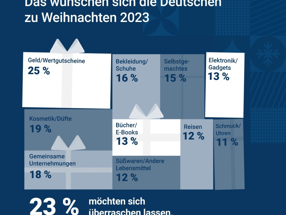 Die Top 5 Weihnachtswünsche der Deutschen sind: Geld und Wertgutscheine (25 Prozent), Kosmetik und Düfte (19 Prozent), gemeinsame Unternehmungen (18 Prozent), Bekleidung und Schuhe (16 Prozent) sowie Selbstgemachtes (15 Prozent). Rund ein Viertel der Befragten (23 Prozent) möchte sich überraschen lassen.