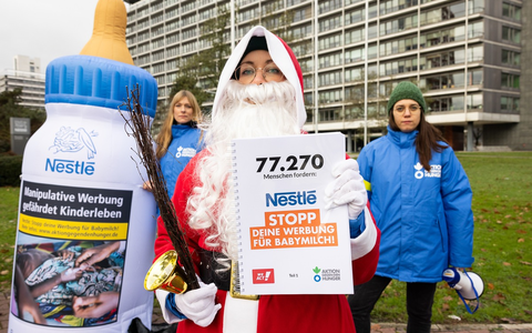 Mit der Kampagne "Nestlé: Stopp deine Werbung für künstliche Babymilch!" fordert Aktion gegen den Hunger mit Unterstützung von WeAct, der Petitionsplattform von Campact, den multinationalen Lebensmittelkonzern dazu auf, Milchkodex der Weltgesundheitsorganisation endlich vollumfänglich umzusetzen. Mehr als 77.200 Menschen haben die Petition unterschrieben, die nach der Protestaktion an Nestlé übergeben wird.