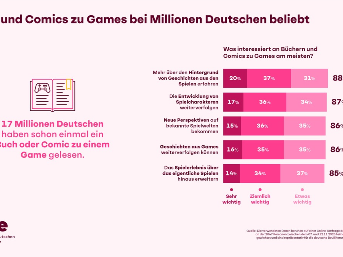 Warum interessieren Bücher und Comics zu Games besonders? Rund 9 von 10 (88 Prozent) der an solchen Werken Interessierten möchten mehr über den Hintergrund von Geschichten aus den Spielen erfahren. Knapp 87 Prozent möchten im Buch oder Comic die Entwicklung von Spielcharakteren weiterverfolgen. Für jeweils 86 Prozent der Lesenden und Interessenten sind Bücher rund um Games spannend, weil sie so neue Perspektive auf bekannte Spielewelten bekommen und die Geschichten aus Games weiterverfolgen können. Für rund 8 von 10 (85 Prozent) erweitern literarische Werke, die mit Games zu tun haben, das Spielerlebnis über das eigentliche Spielen hinaus.