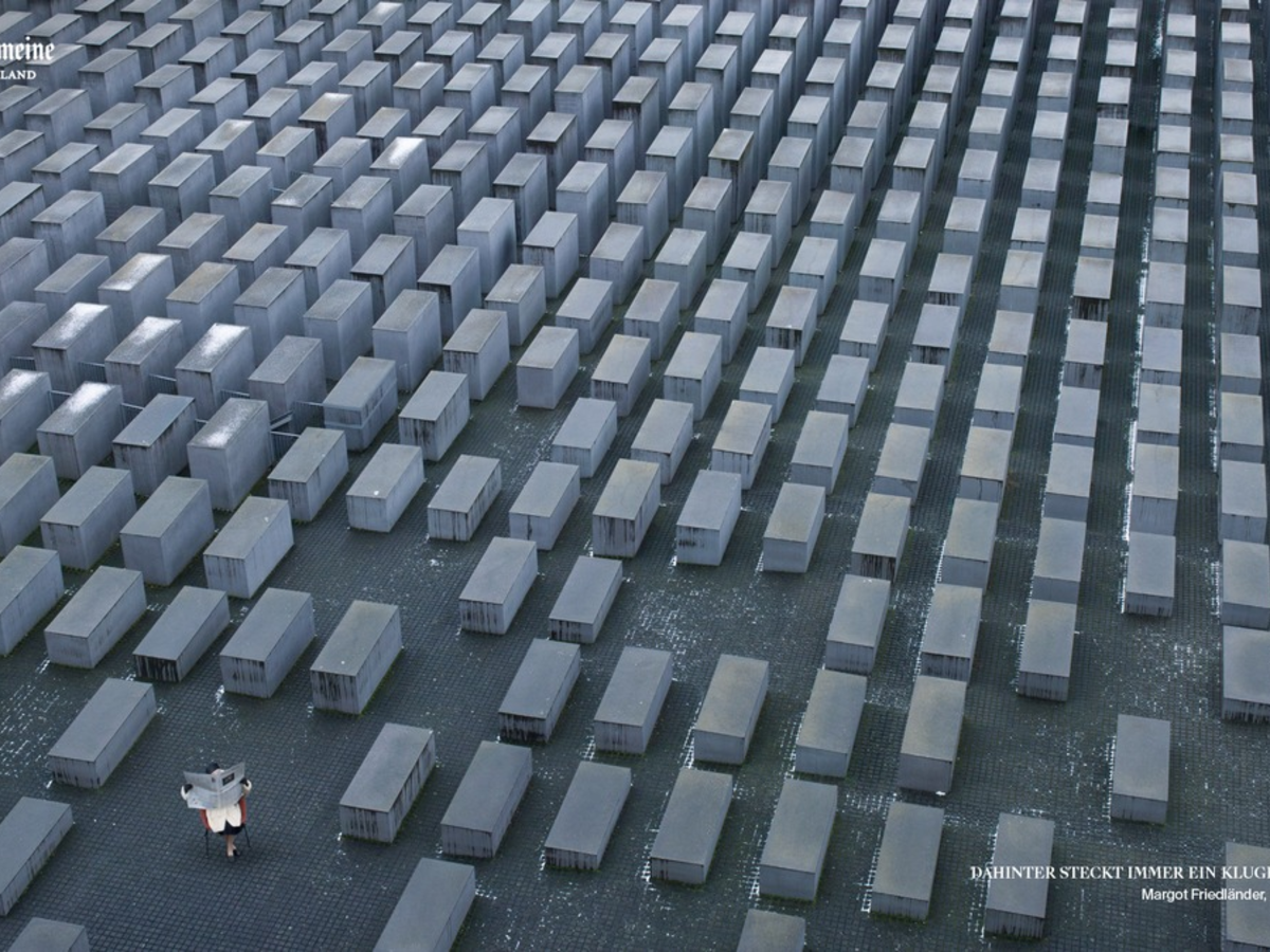Umgeben von mehr als 2700 Betonstelen, die an die ermordeten Jüdinnen und Juden in Europa erinnern, sitzt eine Frau, die den Holocaust überlebt hat: Margot Friedländer. Mit der Zeitung in den Händen und der Geschichte vor Augen ist die 102-Jährige die Protagonistin des 100. Motivs der preisgekrönten F.A.Z.-Kampagne "Dahinter steckt immer ein kluger Kopf". Für sie selbst ist das Denkmal für die ermordeten Juden Europas in Berlin der richtige Ort, um die Relevanz der Geschichte für die Gegenwart zu verdeutlichen: "Es soll zeigen: Seht, das waren Menschen genau wie ihr, die es damals nicht geschafft haben", sagt Friedländer.