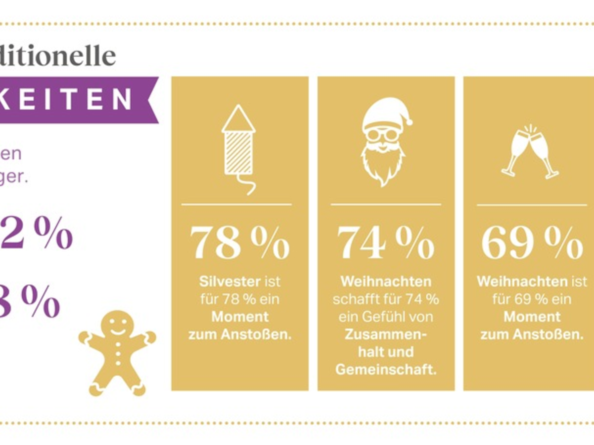 Das Traditionsbewusstsein der Deutschen zeigt sich auch in der klassischen Getränkewahl: In der Vorweihnachtszeit wird Glühwein getrunken, Weihnachten gehören Wein und Sekt auf die Festtagstafel und an Silvester wird mit Schaumwein angestoßen.*
