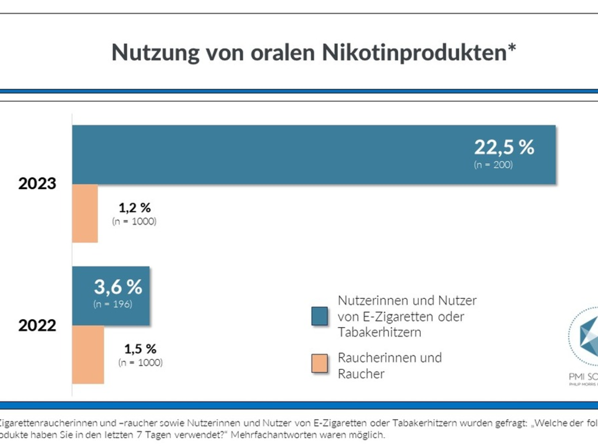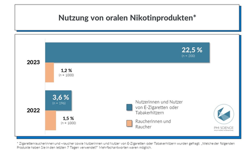 Zusätzlich hat die Studie im Jahr 2023 untersucht, inwiefern die beiden Nutzergruppen orale Nikotinprodukte verwenden, und mit Ergebnissen aus dem Jahr 2022 verglichen. Insbesondere eine Entwicklung unter Nutzerinnen und Nutzern von E-Zigaretten und Tabakerhitzern ist dabei auffällig: Ungefähr jeder Fünfte (22,5 %) gab an, in den vergangenen sieben Tagen orale Nikotinprodukte, sogenannte Nikotinbeutel oder Snus, genutzt zu haben. Im Vorjahr lag diese Zahl noch bei lediglich 3,6 %. Unter Raucherinnen und Rauchern gaben nur 1,2 % an, diese Produkte in den letzten sieben Tagen genutzt zu haben (im Jahr 2022 lag die Zahl bei 1,5 %).