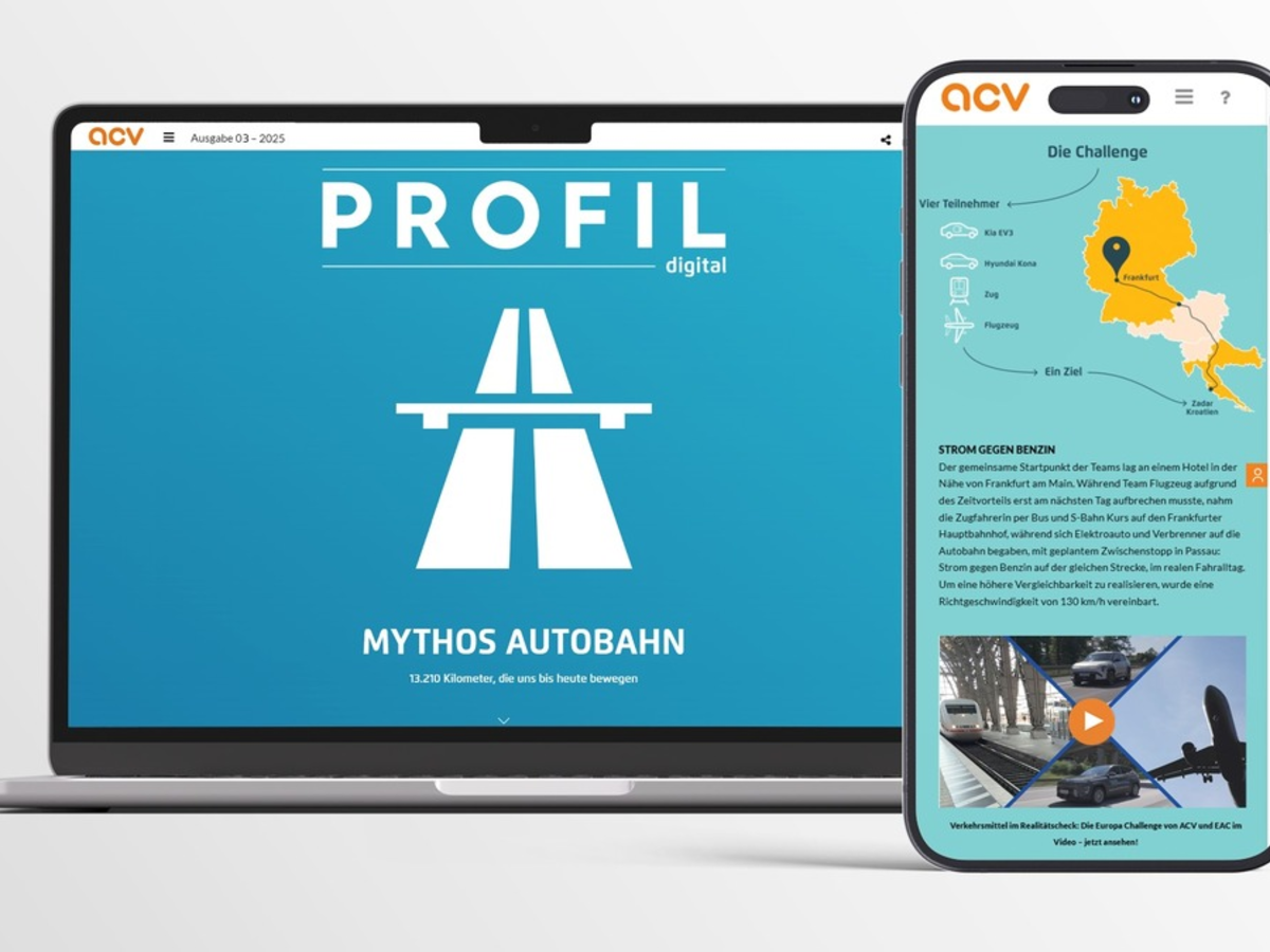 Der ACV stellt die interaktiven Online-Versionen seines Mitgliedermagazins kostenlos und mit zusätzlichen Inhalten auf seiner Website zur Verfügung: PROFIL digital - Magazin des ACV.