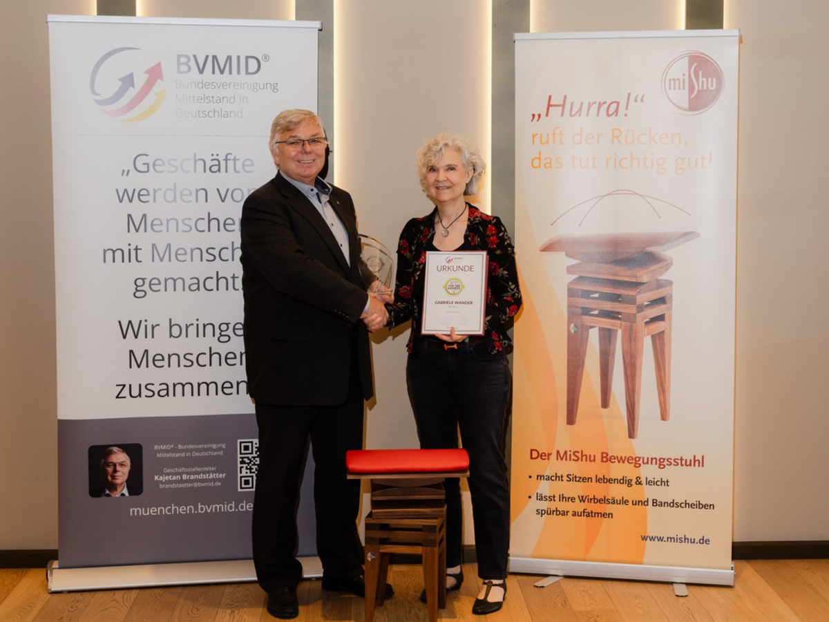 "Gabriele Wander ist es gelungen, ein wirklich einzigartiges Produkt zu schaffen, das an Funktionalität kaum zu übertreffen ist. Zudem sieht der Stuhl ästhetisch aus und ist auch noch nachhaltig. Ausgezeichnet haben wir aber nicht den Stuhl selbst, sondern seine Erfinderin: Rückenschmerzen sind eine Volkskrankheit, die in der deutschen Wirtschaft für massive Kosten durch Mitarbeiterausfälle sorgt. Gabriele Wander schafft mit dem MiShu-Stuhl, in Verbindung mit Ihrer langjährigen Expertise, Abhilfe und minimiert somit auch die Ausfallquote von Mitarbeitern. Dafür haben wir sie als TOP EXPERTE 2024 ausgezeichnet." - so Kajetan Brandstätter, Präsident der BVMID - Bundesvereinigung Mittelstand in Deutschland.