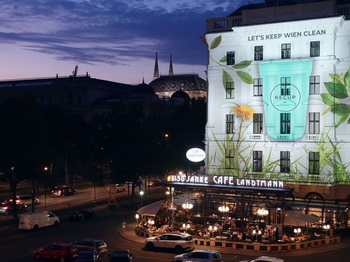 Vom 17. bis 23. Juli 2024 ab ca. 21:30 Uhr zeigt eine Projektion auf der 300 qm großen Hauswand des Café Landtmann, am Universitätsring in Wien, den RECUP-Mehrwegbecher als Antwort auf die Müllproblematik durch To-go-Becher. Begleitet wird die Aktion mit dem Slogan "Let's keep Wien clean", der die einfache und effektive Alternative zu Einwegverpackungen unterstreicht. Alexander Burger, Head of Marketing von RECUP, betont: "Mit unserer Kampagne 'Let's keep Wien clean' wollen wir zeigen, dass es eine einfache und praktische Lösung für das Problem Einwegverpackung gibt und dazu aufrufen, gemeinsam mit allen Wienerinnen und Wienern aktiv Einwegmüll zu reduzieren". Die Kampagne wurde gemeinsam mit der Agentur I like Visuals entwickelt und umgesetzt. Neben der Out-of-Home-Projektion wird die Kampagne aktiv in den sozialen Medien begleitet. Darüber hinaus macht ein mobiles Espressomobil das RECUP-System vor Ort erlebbar: Vom 17. bis 21. Juli 2024 können Gastronomiebetriebe und Endverbrauchende an der Hauptuni Wien und im Votivpark gratis Kaffee im RECUP genießen und sich über das Mehrweg-Pfandsystem informieren.