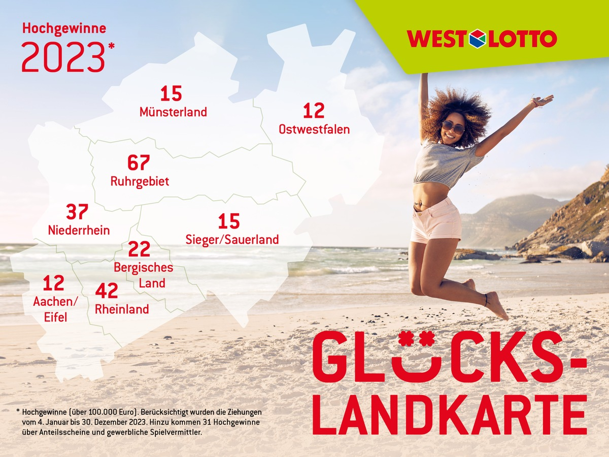 Was die geografische Verteilung der Hochgewinne in Nordrhein-Westfalen betrifft, bleibt das Ruhrgebiet, wie in den Vorjahren, unangefochten die Nummer 1. Dort freuten sich insgesamt 67 Spielteilnehmer über einen mindestens sechsstelligen Gewinn. Mit auf das Siegertreppchen schafften es - wie in den Vorjahren - zudem das Rheinland (Gebiet von Düsseldorf bis Bonn) mit 42 und der Niederrhein mit 37 Hochgewinnen. In den Regionen Westfalens waren die Hochgewinner relativ gleich verteilt: das Münsterland sowie das Sieger-/Sauerland kommen auf jeweils 15 und die Region Ostwestfalen auf 12 Hochgewinne.