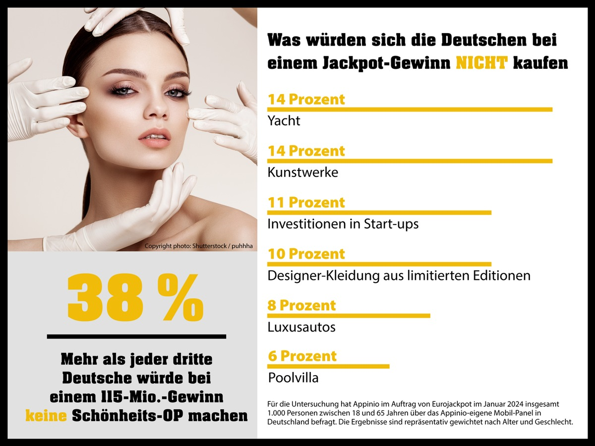 "Was würdest du dir mit einem Millionengewinn gönnen?", ist eine häufig gestellte Frage, die zum Träumen verleitet. Doch was würden sich Jackpotgewinner NICHT kaufen? So ungewöhnlich die Fragestellung, so überraschend die Antworten: 38 Prozent der Deutschen geben an, auf keinen Fall in eine Schönheits-OP investieren zu wollen - auch nicht mit einem möglichen Jackpotgewinn von rund 115 Millionen Euro auf dem Konto. Das ergab eine repräsentative Umfrage von Appinio im Auftrag der Lotterie Eurojackpot.*