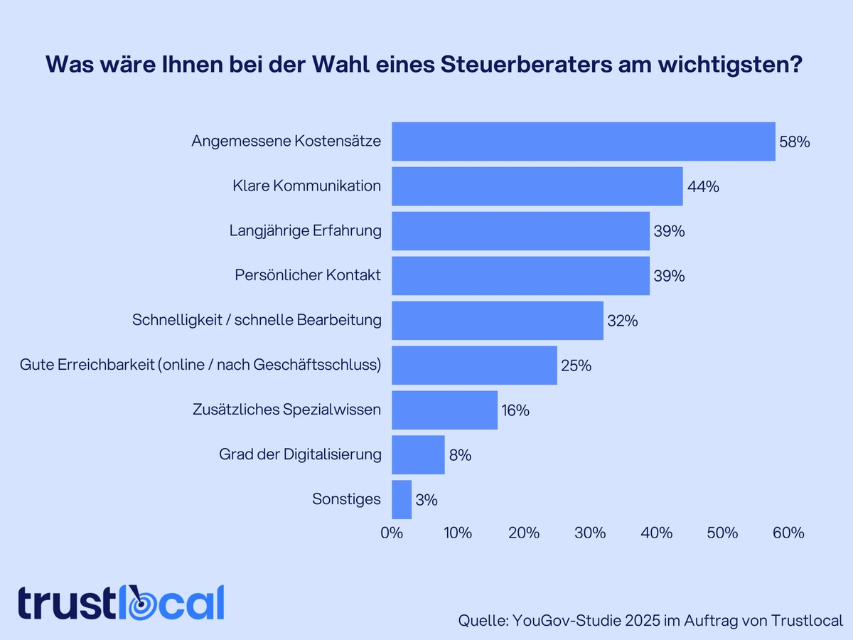 Die Zahlen machen deutlich, dass der Steuerberatungsmarkt für manche Personen sehr unübersichtlich in Bezug auf Qualität, Spezialisierung und Kosten ist (sehr schwierig: 18 Prozent). 43 Prozent der Befragten geben an, dass die am besten geeigneten Anbieter oft keine neuen Mandanten annehmen oder zu teuer erscheinen (schwierig: 43 Prozent). "Es fehlt an Klarheit, Orientierung und digitalen Zugängen", sagt Manuel Eiteljörge, Country Manager bei Trustlocal. "Die Branche steht vor der Aufgabe, strukturierte, digitale Lösungen zu schaffen, um Vertrauen und Erreichbarkeit zu stärken", so Eiteljörge weiter.