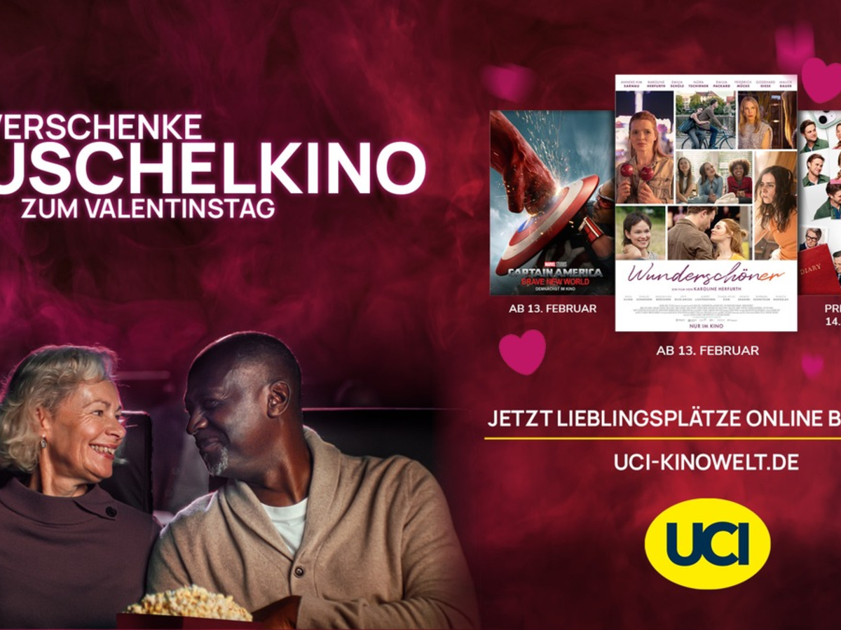 Wer noch auf de Suche nach einem perfekten Kinogeschenk zum Valentinstag ist, findet im UCI-Shop auf uci-shop.de jetzt Kinogutscheine zum Valentinstag als Geschenkkarte oder E-Gutschein zum Selbstausdrucken bereits ab 10 EUR. Die Gutscheine können flexibel aufgeladen und dann für Kinotickets oder Produkte an der Erfrischungstheke eingelöst werden. Wer Kinoliebe ohne Grenzen verschenken will, kann dies auch mit der UCI Unlimited Card tun - jetzt auch im 3- Monatsabo bereits ab 19.90 EUR. Erhältlich unter uci-unlimited.de