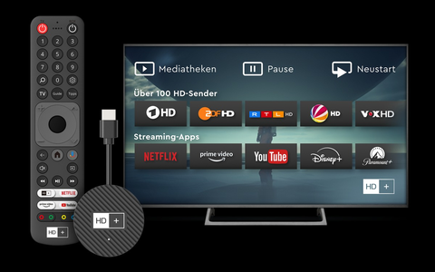 Der HD+ IP TV-Stick bietet nicht nur Live-TV in bester HD-Qualität, sondern auch Zugriff auf alle Funktionen der HD+ TV-App, wie die Suche von Inhalten in verschiedenen Mediatheken gleichzeitig, Pause, Neustart und einen umfassenden Programm-Guide. Außerdem können beliebte Streaming-Apps wie Netflix, YouTube oder Prime Video direkt aufgerufen und viele weitere über den Google Play Store genutzt werden. Die mitgelieferte Fernbedienung sorgt dabei für zusätzlichen Komfort und Benutzerfreundlichkeit.