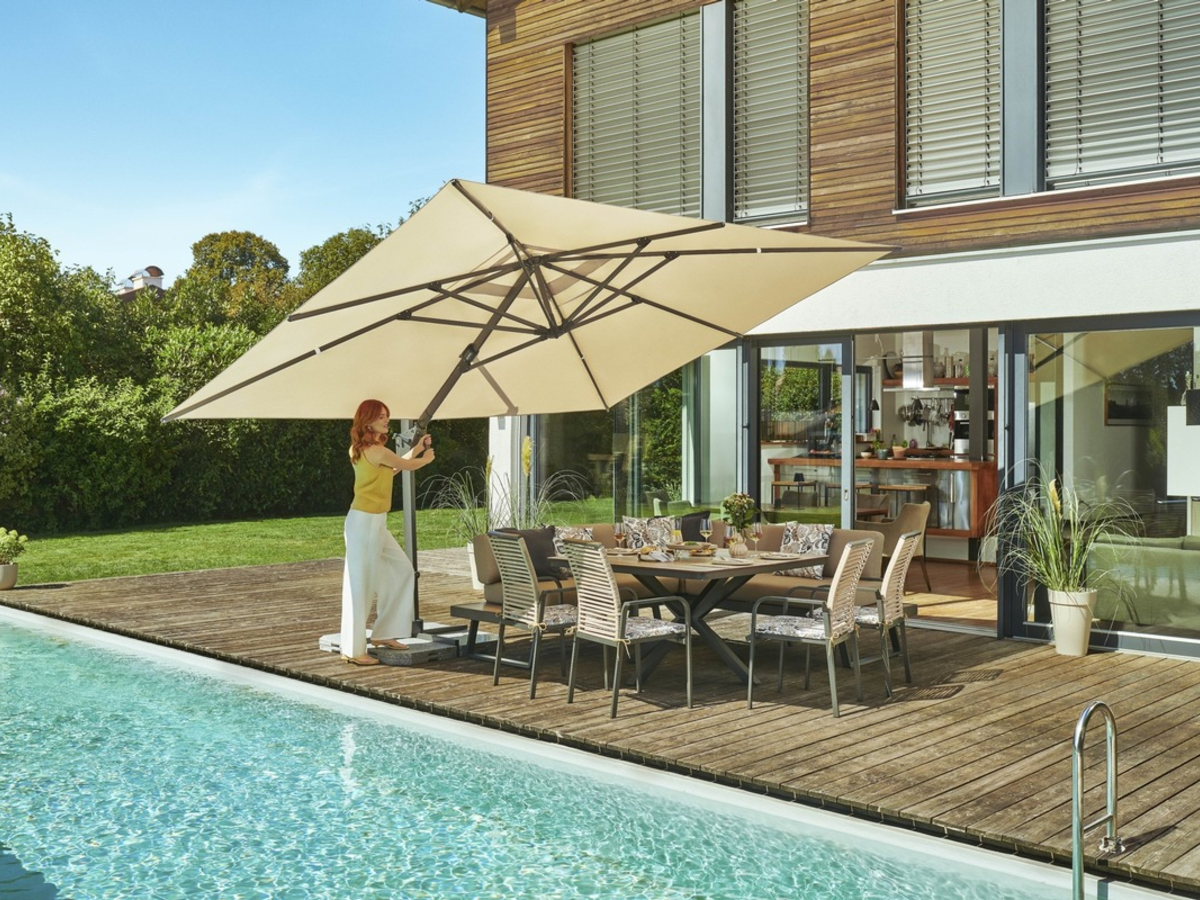 Die neue Knirps Pendelschirm Serie HYPERION ist ganz auf Komfort, Flexibilität und Design ausgerichtet. Ein stufenlos neigbares Schirmdach, der um 360 Grad freidrehbare Mast und der seitliche Schwenkmechanismus sorgen dafür, dass der Schatten jederzeit dort ist, wo er gebraucht wird. Der elegante Hyperion ist in zwei Varianten erhältlich: als rechteckige Ausführung (330 x 240 cm) und in der klassisch runden Ausführung (Durchmesser 340 cm). Neben einer Bespannung aus widerstandsfähigem Polyestergewebe sind auch exklusive Acrylgewebe-Stoffe aus Portugal erhältlich. Alle Bezüge sind schmutz- und wasserabweisend sowie mit einem UV-Schutz von nahezu 100 % ausgestattet und für besondere Langlebigkeit selbstverständlich abnehmbar. Der optional verfügbare 140kg-Rollsockel, sorgt für zusätzliche Flexibilität. Auch auf die Hyperion-Schirme gilt selbstverständlich die 5-Jahresgarantie von Knirps.