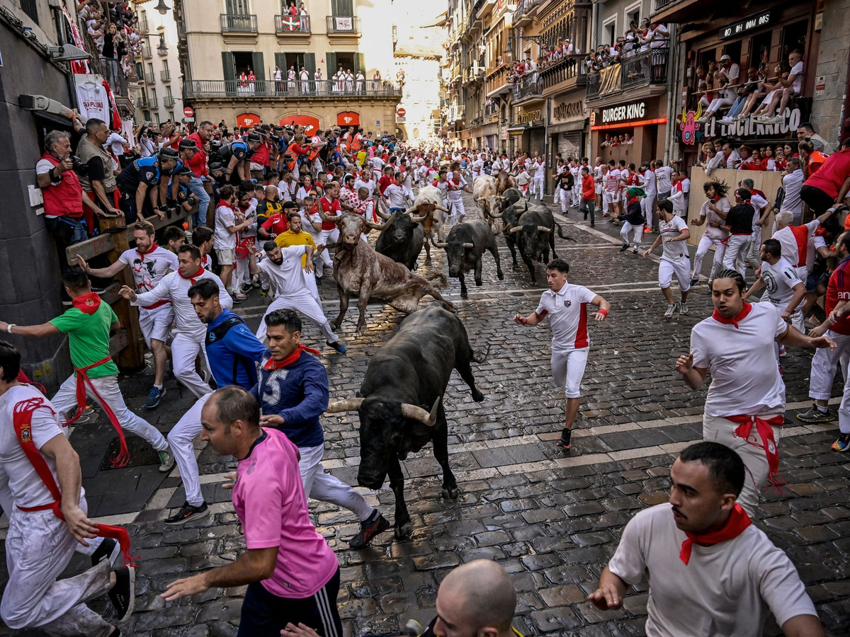 Mit verstauchtem Finger und einer Beule am Knie ist Patxi Ibáñez noch einmal glimpflich davongekommen. Bei der ersten Stierhatz des diesjährigen «Sanfermines»-Fests im nordspanischen Pamplona ist der 50-Jährige zu Boden gegangen. Er hat ebenso wie weitere fünf Verletzte Glück gehabt: Keiner der bis zu 600 Kilogramm schweren Bullen ist auf ihn getreten oder hat ihn gar mit seinen spitzen langen Hörnern aufgespießt.