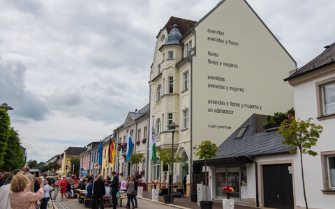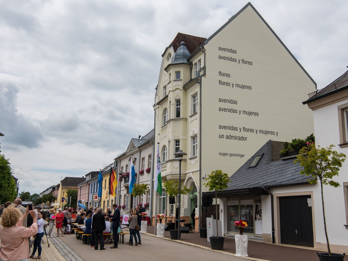 100 Exponate zeigt die Stadt zum 100. Geburtstag: Bilder, Bücher und Objekte des Jubilars, darunter eine Reihe von Gedichten aus der «Sammlung Gomringer III». Bürgermeister Michael Abraham sagte, die Schau zeige, dass Gomringers künstlerisches Wirken und sein Einfluss weit mehr umfasst als die Gedichte, die er schrieb.