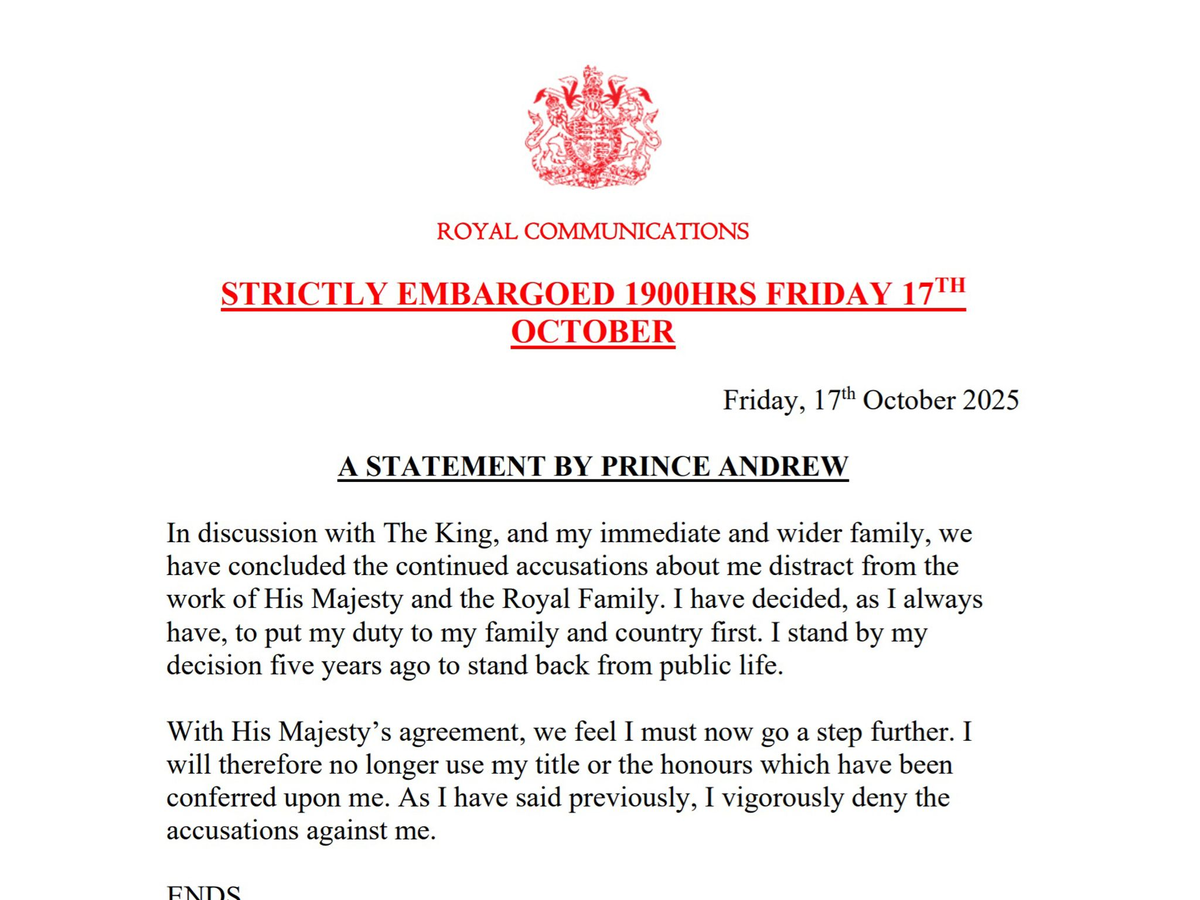 Nach neuen mutmaßlichen Beweisen für die wohl tiefe Freundschaft zwischen Andrew und Epstein und kurz vor der Veröffentlichung der Memoiren des bekanntesten Opfers hatte der Prinz am Freitagabend seine verbliebenen Titel und Ehrungen aufgegeben. «Nach Diskussionen» mit dem König und seiner Familie, steht in der offiziellen Mitteilung. Der Tenor der britischen Medien ist aber klar: Andrew musste verzichten - sonst hätte der König den Sturz angeordnet.