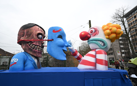 Beim Thema AfD entschied sich Tilly für einen Clown, der der AfD die freundliche Maske abnimmt - dahinter kommt ein Totenschädel zum Vorschein. Spätestens seit den Correctiv-Enthüllungen über das Potsdamer Rechten-Treffen sei klar, wes Geistes Kind die AfD sei, sagte der Bildhauer. Das treibe jetzt auch die Menschen auf die Straße - was ein zweiter Wagen zu der Thematik zum Ausdruck bringe: Darauf wird ein giftiger kleiner Fisch mit der Sprechblase «Wir sind das Volk!» von einem viel größeren gefressen. Dessen Aufschrift: «Wir sind mehr!»
