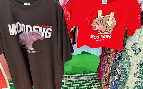 Denn wenn es um Moo Deng geht, gibt es fast nichts, was es nicht gibt. Schlüsselanhänger in Hippo-Form, Plüschtiere mit rosa Moo-Deng-Wangen, T-Shirts und Tassen mit ihrem Antlitz und allerlei Figürchen und Nippes, so ging es los. Mittlerweile hängen neben Thailands berühmten Elefantenhosen auch solche mit Moo-Deng-Muster. Zudem wurden ihr Sticker und Aufkleber, Postkarten, Kissen, Kalender, Einkaufstaschen, Gedenkmünzen, Malbücher und Smartphone-Hüllen gewidmet.
