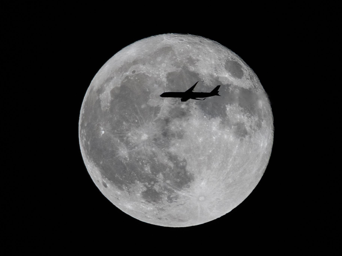 Ein Flugzeug fliegt an einem großen Vollmond vorbei. - Foto: Ringo Chiu/SOPA Images/ZUMA Press Wire/dpa