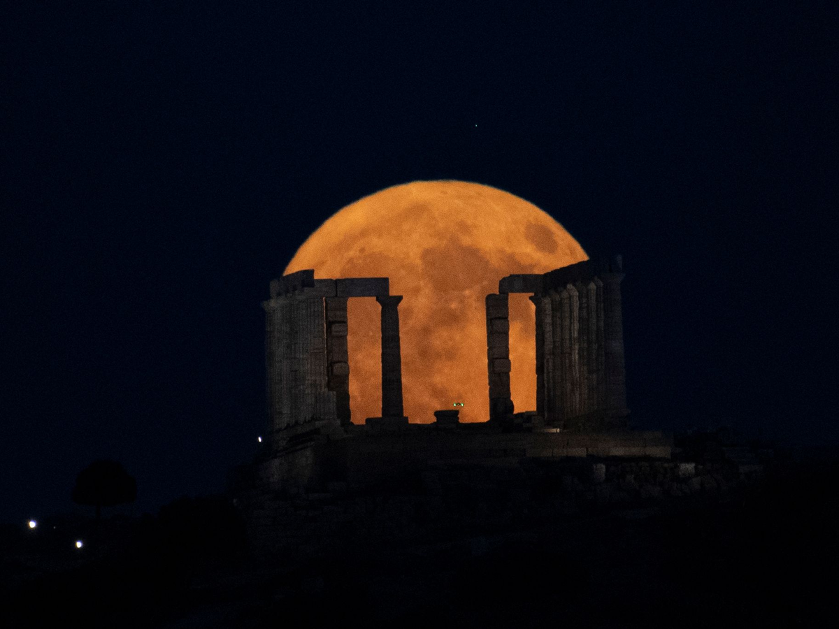 Der Supermond geht hinter dem Poseidon-Tempel am Kap Sounio südlich von Athen auf. - Foto: Michael Varaklas/AP/dpa