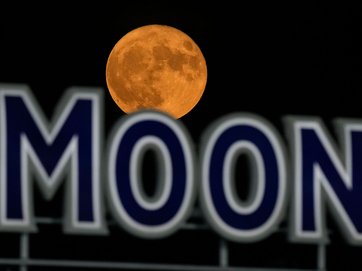 Der Vollmond geht über einem Bierschild im Kauffmann Stadium in Kansas City auf. - Foto: Charlie Riedel/AP
