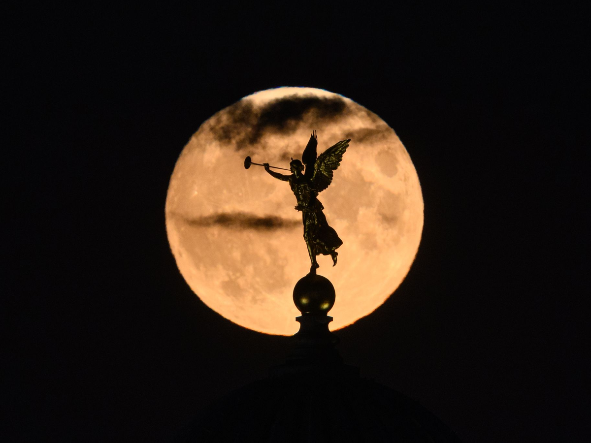 Hinter der Poseidon-Statue in Kopenhagen ist am Himmel ein großer Vollmond zu sehen. - Foto: Thomas Traasdahl/Ritzau Scanpix Foto/AP