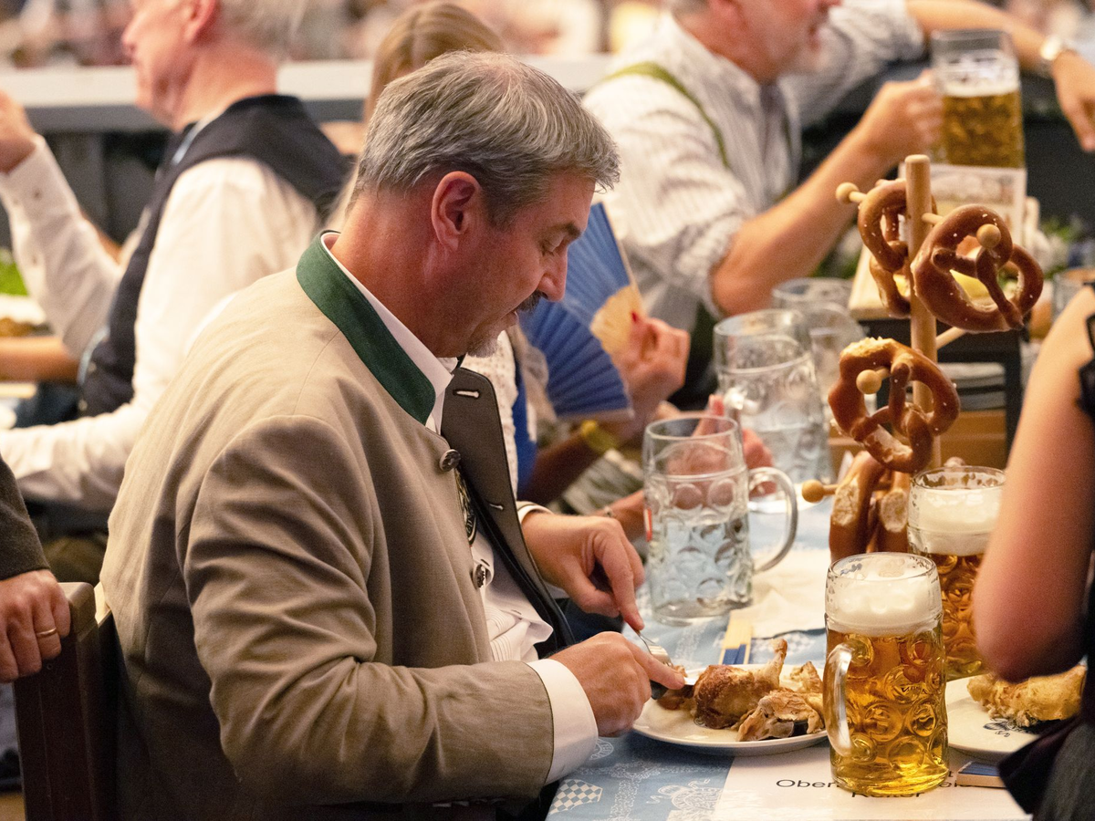 Söder zeigt Verständnis - auch dafür, dass Reiter etwas spritziger anzapfte als üblich: «Der runde Schlegel ist fies – da kann man leicht abrutschen», sagt er, der zum zweiten Mal in Lederhose zum Anzapfen gekommen ist. Aber: «Was kann es heute schöneres Parfum geben auf der Haut als Bier.»