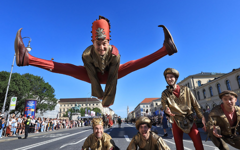 Auch beim traditionellen Trachtenumzug am Sonntag brennt die Sonne. Zahlreiche Teilnehmerinnen und Teilnehmer in traditioneller Tracht ziehen durch die Innenstadt - ein bayerisches Brauchtumsspektakel.