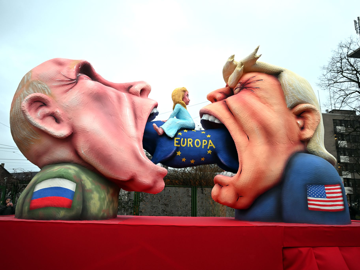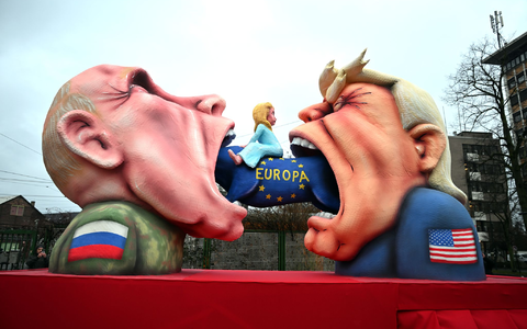 Mit besonderer Spannung erwartet wurden diesmal die Düsseldorfer Rosenmontagswagen, weil Wagenbauer Jacques Tilly aktuell von der russischen Justiz verfolgt wird. Dennoch ist der russische Präsident Wladimir Putin gleich dreimal auf den 13 Motivwagen in Düsseldorf vertreten: Einmal steuert er eine blaue Drohne mit der Aufschrift AfD, ein weiterer Wagen zeigt ihn mit US-Präsident Donald Trump, wie beide Europa verspeisen.
