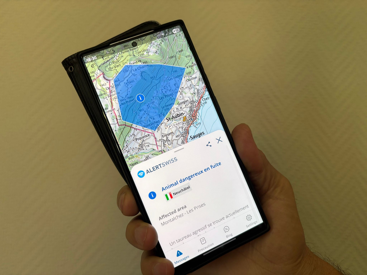 Das Tier war in der Wanderregion Montalchez-Les Prises im Kanton Neuenburg. Die Polizei hatte über die App gewarnt, man dürfe sich dem 600-Kilogramm-Tier keinesfalls nähern. Vielmehr sollte die Polizei bei einer Sichtung über den Notruf 117 alarmiert werden.