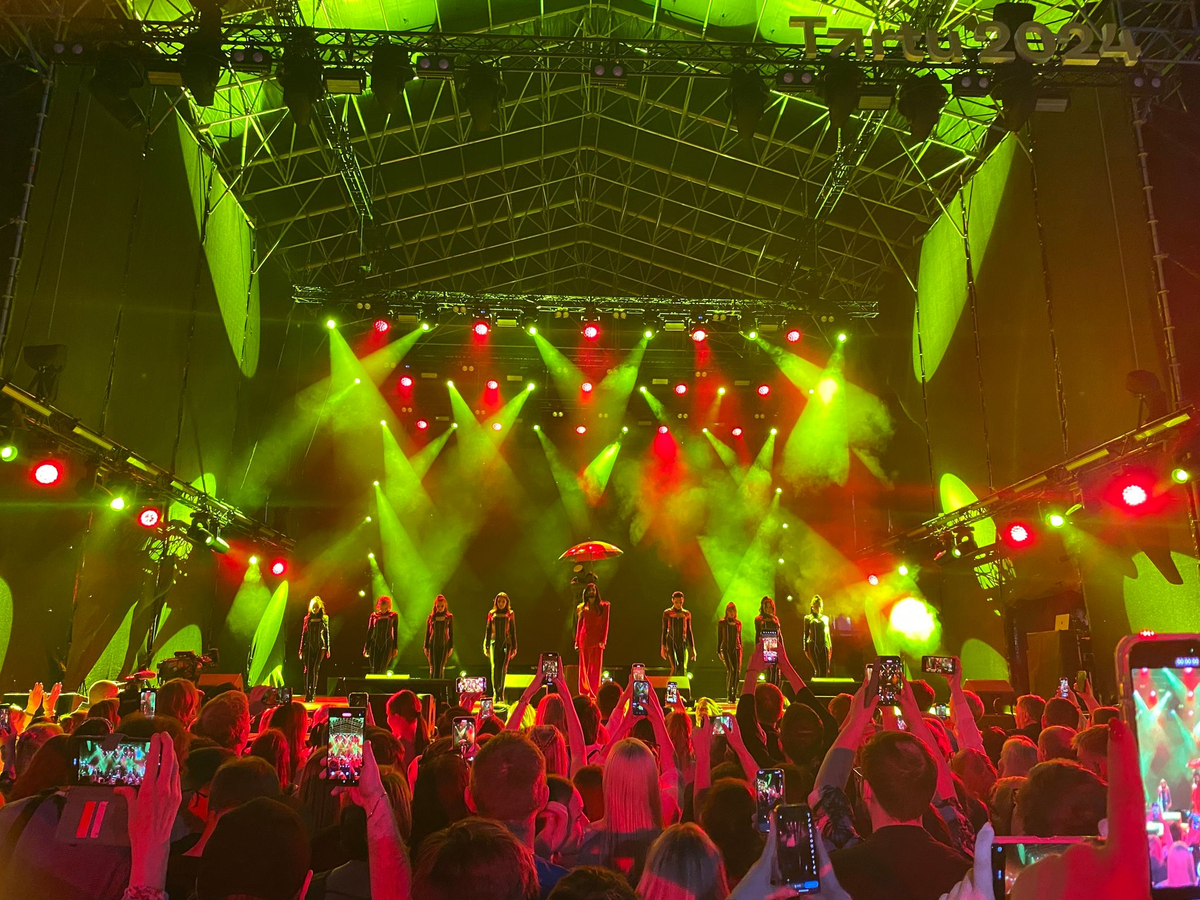 Aufgebaut war die Bühne in Tartu vor dem historischen Rathaus um den Brunnen mit den Bronzefiguren zweier sich unter einem Schirm innig umarmender und küssender Studenten. Die Skulptur mit dem Namen «Küssende Studenten» gilt als Wahrzeichen der knapp