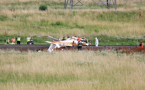 Fotos und Videoaufnahmen zeigten das auf dem Kopf liegende kleine Flugzeug vom Typ Cessna 172 zwischen den Fahrbahnteilern aus Beton in der Mitte der Autobahn. Brennende Wrackstücke waren auf die Fahrbahn geschleudert worden und ein Rettungshubschrauber landete am Unglücksort. Feuerwehr und Rettungskräfte waren auf der Autobahn im Einsatz.