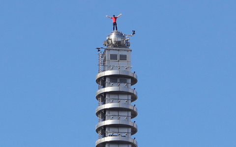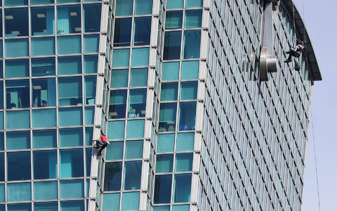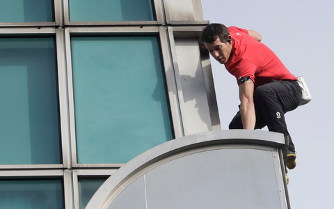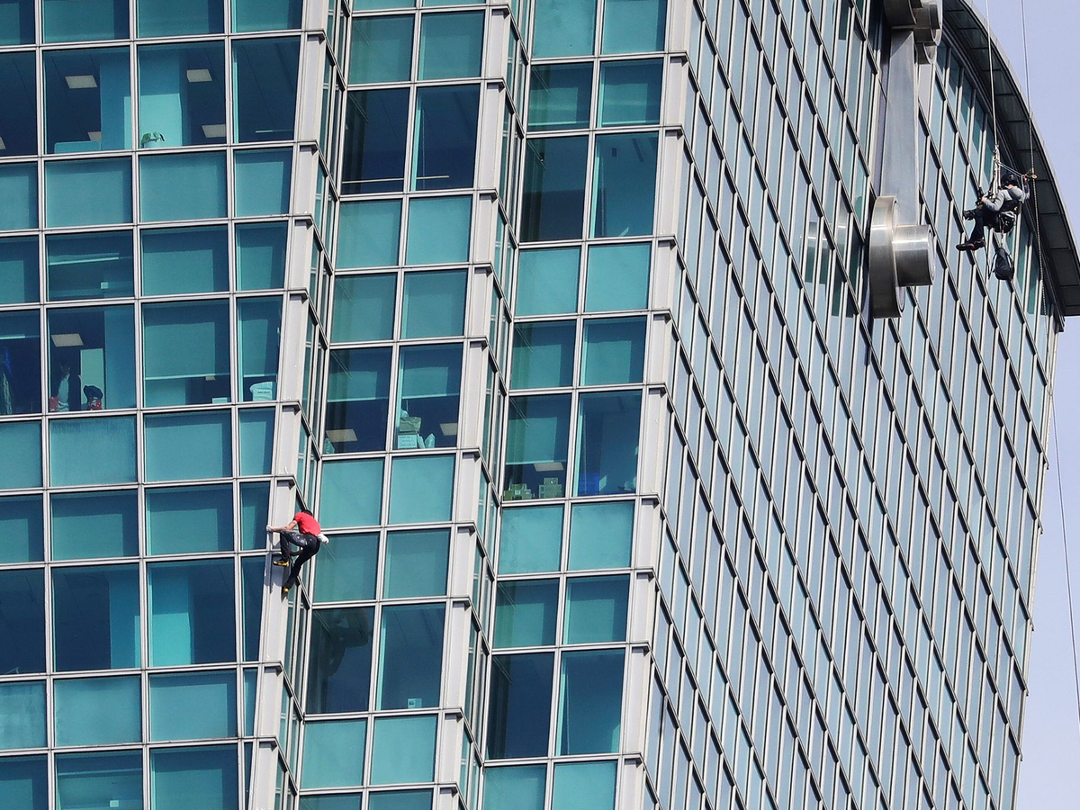 Auf der 60. Etage waren sie sich bereits begegnet - sie drinnen mit dem Daumen nach oben, er außen an der Fassade. Auch sonst verfolgten Schaulustige den Aufstieg hinter den Glasfassaden der Bürofenster. Nicht wenige hielten die Momente mit dem Smartphone fest, andere bunte Plakate mit Durchhalteparolen hoch.