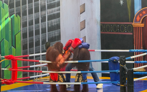 Zwei Orang-Utans tapsen in engen Sporthosen und Boxhandschuhen in den Ring, angefeuert von Animateuren. Die Menschenaffen schlagen einstudierte Haken, werfen sich theatralisch zu Boden. Schließlich reißt der vermeintliche Sieger die Arme in die Höhe. Aber Sieger sind hier nur die Betreiber, bei denen jeden Tag die Kasse klingelt.