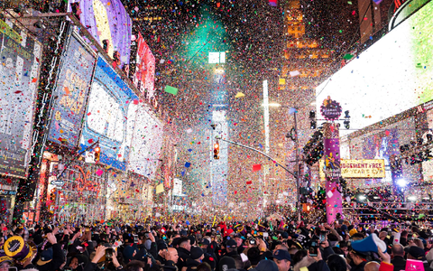 Um Mitternacht gleitet eine leuchtende Kristallkugel an einem Fahnenmast herunter - der sogenannte Ball Drop, danach schallen die Lieder «Auld Lang Syne» und «New York, New York» durch die Straßen der US-Metropole.