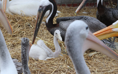 Männliches Pelikanpärchen adoptiert Küken