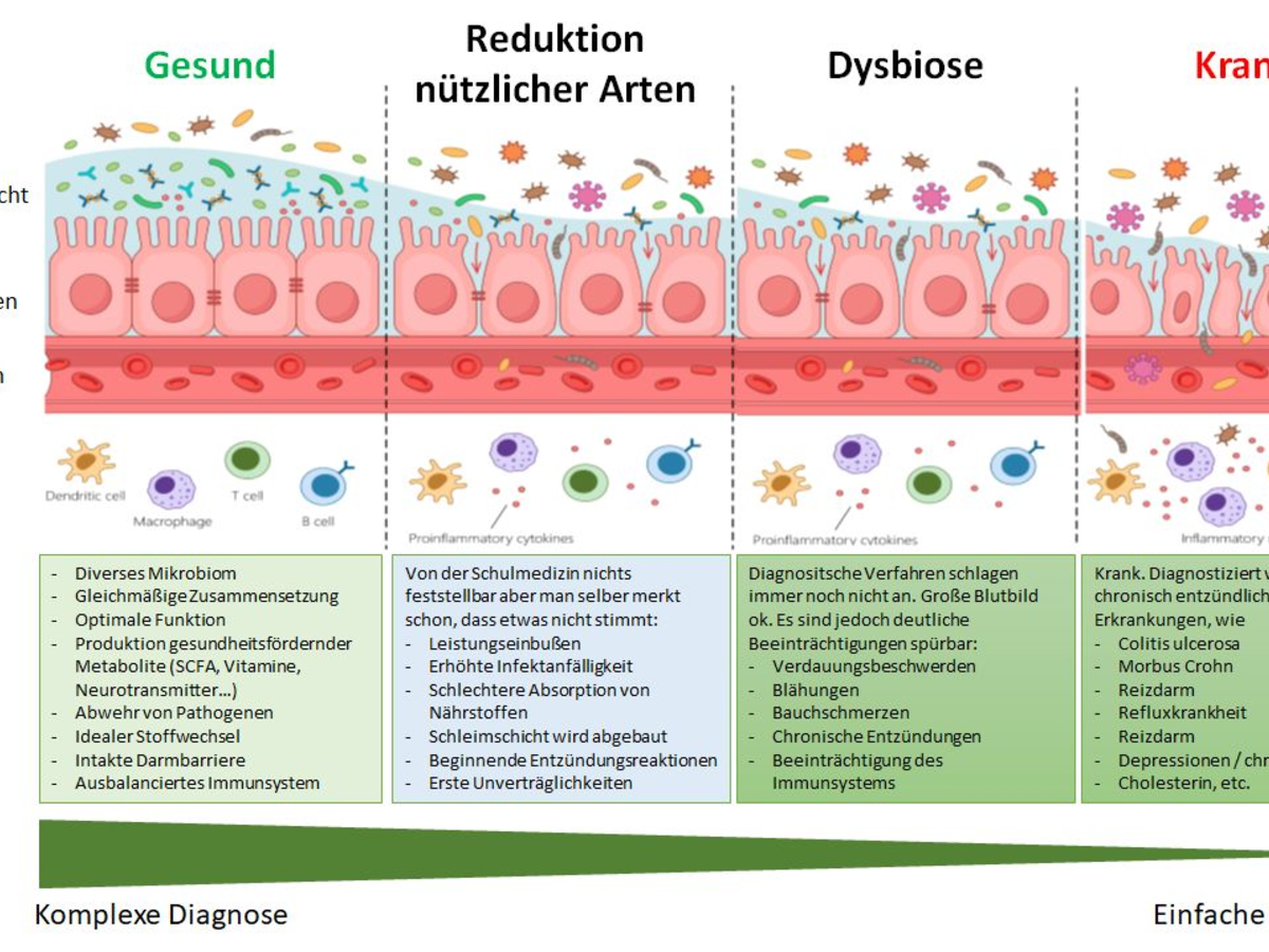 26.03.2025 - 18:00:00 | pressetext.deDer Ablauf der Pathogenese ist immer gleich: Die Mikrobengemeinschaft im Darm ist in ihrer Funktion bzw. Stoffwechselleistung beeinträchtigt (Dysbiose), die Darmschleimhaut wird abgebaut und die äußeren Zellen der Darmwand werden nicht mehr ausreichend versorgt, was zur Folge hat, dass die Darmschutzschicht durchlässig wird (Leaky Gut) und Bakterien bzw. Bakterienteile in den Körper eindringen können. Für das Immunsystem (80 Prozent sitzen im Darm) bedeutet das eine Überlastung (TH2-Shift), was zu Krankheiten wie Allergien, Autoimmunkrankheiten, Neurodermitis, Reizdarm, Colitis, Krebs, etc. führt, da das Immunsystem nicht mehr auf der TH1 Seite aktiv werden kann.