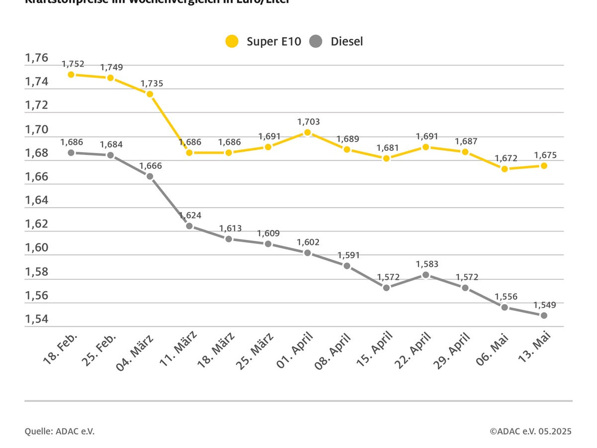 Begleitet wird die gegensätzliche Entwicklung der Kraftstoffpreise von einem gestiegenen Rohölpreis, der sich wieder deutlich von der Marke um 60 US-Dollar je Barrel der Sorte Brent entfernt hat. So kostet ein Fass mit ca. 159 Litern derzeit fast 67 US-Dollar nach rund 62 US-Dollar in der Vorwoche. Die Ölpreise ziehen vor allem wegen der vorübergehenden Zollpause zwischen den USA und China und der damit einhergehenden Markterholung wieder an.