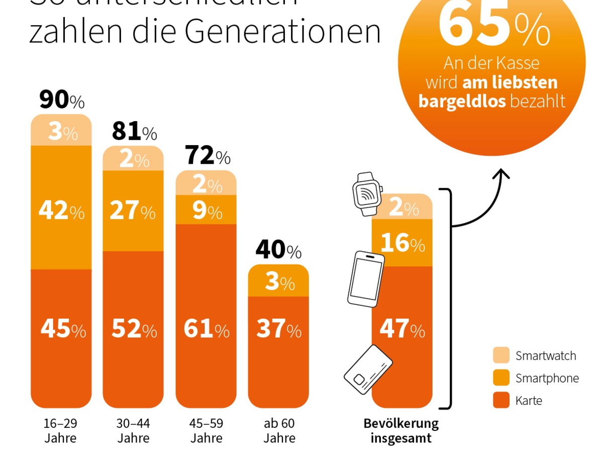 Der Trend zum digitalen Bezahlen manifestiert sich im kontinuierlichen Wachstum von Mobile Payment: Jede:r Vierte (25 Prozent) gab an, schon einmal mit seinem Smartphone oder seiner Smartwatch bezahlt zu haben - damit hat sich die Anwendung dieses Zahlungsverfahrens in den letzten drei Jahren mehr als verdoppelt (2022: 12 Prozent). Besonders bei Personen unter 30 Jahren ist Mobile Payment beliebt: 42 Prozent bezahlen am liebsten mit ihrem mobilen EndgerÀt. Damit liegt Bezahlen mit Smartphone oder -watch bei dieser Altersgruppe fast gleichauf mit der klassischen Kartenzahlung (45 Prozent).