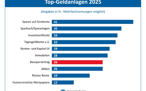 Das Anlageverhalten bleibt damit überwiegend konstant, sowohl bei der Reihenfolge als auch bei den Werten. Mit drei Ausnahmen: Während das Tagesgeld nicht mehr ganz so oft genannt wird, erfahren Investmentfonds und Bausparen Zuwächse. "Die Sparer setzen auf Konstanz und Sicherheit, richten ihren Blick aber auch verstärkt in die Zukunft - einerseits mit Fonds, andererseits mit dem Bausparen, um frühzeitig für den späteren Immobilienerwerb zu sparen und sich niedrige Darlehenszinsen zu sichern", erläutert der Hauptgeschäftsführer des Verbands der Privaten Bausparkassen, Christian König, die Zahlen.