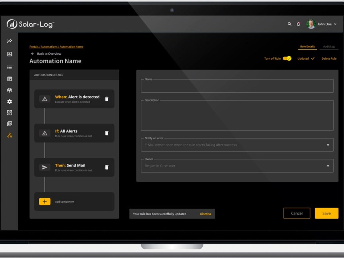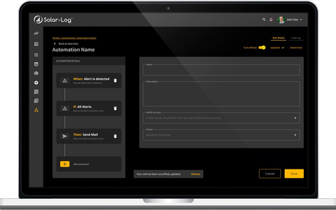 Mit dem Enerest Automations führt Solar-Log eine neue Funktion für das Portal Solar-Log WEB Enerest(TM) 4 ein. Automations ist eine Lösung zur Regelerstellung ohne Code, d. h. Regeln werden auf der Basis von Ereignissen aus dem Solar-Log WEB Enerest(TM) 4 nach dem Prinzip "Wenn dies, dann das" erstellt. Die Regeln können so eingerichtet werden, dass sie den einzelnen Anforderungen des Nutzers entsprechen.