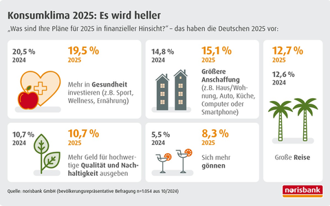 Bereits zu Beginn des letzten Jahres gab es erste Anzeichen dafür, dass die Konsumfreude zurückkehrt. Die aktuelle Umfrage im Auftrag der norisbank bestätigt diesen Trend. Auch wenn die Deutschen letztes Jahr wieder hohe Sparquoten erreicht haben, um ihren Wunsch nach Sicherheit zu erfüllen. Für 2025 spielen Konsumpläne wieder eine stärkere Rolle als im Vorjahr. 31,8 Prozent der Deutschen planen für 2025 eine größere Anschaffung oder eine große Reise und sind auch bereit, beim Kauf von Produkten zukünftig mehr Geld für Qualität und Nachhaltigkeit auszugeben. Zum Vergleich: Im Jahr 2024 lag dieser Wert bei 29,8 Prozent und 2023 sogar nur bei 23,8 Prozent. Diese steigende Bereitschaft, in bedeutende Anschaffungen zu investieren, zeigt, dass die Deutschen trotz gestiegener Preise und wirtschaftlicher Belastungen optimistischer werden.