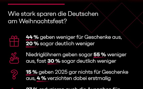 "Auch der Weihnachtsdeko geht es an den Kragen", erklärt Smarsly. Fast die Hälfte der Deutschen (48 %) will hier weniger ausgeben, rund ein Fünftel (19 %) sogar gar nichts mehr. "Natürlich geht es den meisten an Weihnachten nicht um Geschenke, Essen und Deko - dass die Ausgaben 2025 aber so drastisch sinken und viele komplett verzichten, ist ein Alarmzeichen", resümiert Goller.