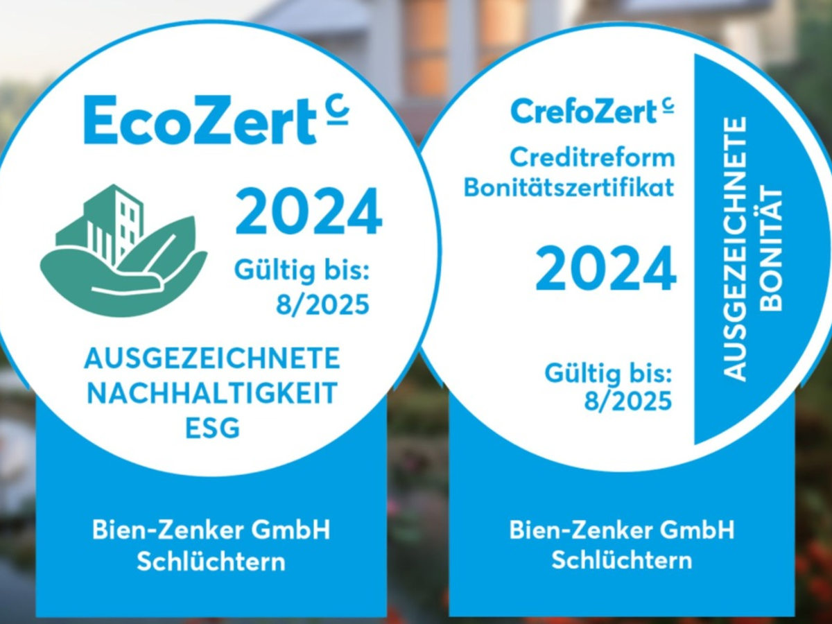 Höhere Zinsen, weltweite Krisen, Klimawandel: Wer sich heute für den Bau eines Eigenheims entscheidet, sucht einen verlässlichen Partner und setzt auf Nachhaltigkeit. Aus diesem Grund hat sich der Fertighaushersteller Bien-Zenker ( www.bien-zenker.de) einer umfangreichen Prüfung seiner Finanzkraft und Corporate Social Responsibility gestellt. Im Ergebnis verleiht die prüfende Wirtschaftsauskunftei Creditreform dem Fertighaushersteller zum wiederholten Male das CrefoZert mit Prädikat "ausgezeichnete Bonität". Zusätzlich erhält Bien-Zenker das EcoZert-Siegel für "ausgezeichnete Nachhaltigkeit" zum zweiten Mal in Folge.