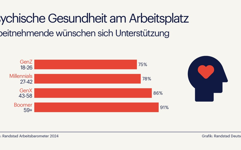 Für die Mehrheit der deutschen Arbeitnehmenden (85 %) ist es ein wichtiges Jobkriterium, Unterstützung für ihre psychische Gesundheit zu erhalten. Das geht aus den Ergebnissen des Randstad Arbeitsbarometers 2024 hervor. Die Studie zeigt auch, dass der Wunsch nach dieser Unterstützung mit dem Alter der Mitarbeitenden zunimmt. Während sich 75 % der 18-26-Jährigen Hilfe wünschen, sind es bei den Altersgruppen 27-42 und 43-58 jeweils 78 % beziehungsweise 86 % - und sogar 91 % in der Altersgruppe 59+.