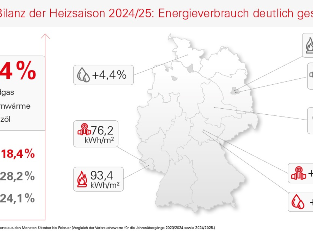 Insgesamt zeigen sich beim Verbrauch regionale Unterschiede: Die stärkste Steigerung bei Heizöl wurde in Thüringen mit +43,1 % (auf 94,3 kWh/m²) festgestellt. Schleswig-Holstein verzeichnete mit +4,4 % (auf 83,9 kWh/m²) den geringsten Anstieg. Sachsen-Anhalt ist mit 59,9 kWh/m² das Bundesland mit dem geringsten Heizölverbrauch. Der Erdgasverbrauch ist im Saarland mit 93,4 kWh/m² am höchsten, während Berlin mit 70,9 kWh/m² den niedrigsten Erdgas-verbrauch aufweist. Und auch bei der Fernwärme führt das Saarland die Länder mit 76,2 kWh/m² an, während Berlin mit 49,4 kWh/m² auch hier am wenigsten verbraucht. Der höchste Anstieg bei Fernwärme konnte in Thüringen mit einem Plus von 45,1 % (auf 52,7 kWh/m²) gemessen werden.