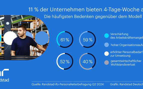 30.08.2024 - 09:00:00 | presseportal.deWeniger Arbeitszeit bei gleichem Gehalt, dafür höhere Produktivität und mehr Work-Life-Balance - das ist das Versprechen der 4-Tage-Woche, die unter deutschen Arbeitnehmenden zumindest in der Theorie hohe Konjunktur hat. Doch wie blicken Arbeitgeber auf das Thema? Halten sie das Konzept für genauso vielversprechend? Die Randstad-ifo-Personalleiterbefragung Q2 2024 zeigt: Die meisten Unternehmen schenken der Idee entweder keine Aufmerksamkeit oder bewerten eine Einführung als nicht möglich.