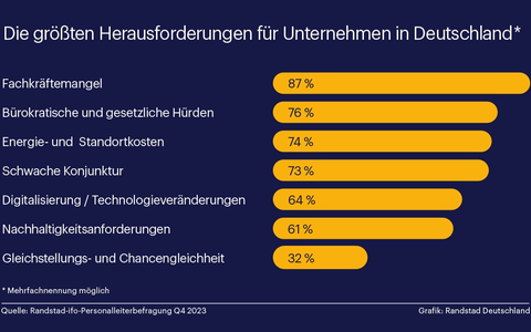 09.02.2024 - 09:00:18 | presseportal.deFür 87 % der Unternehmen in Deutschland stellt der Arbeits- und Fachkräftemangel eine aktuelle Herausforderung dar. Das zeigen die Ergebnisse der Randstad-ifo-Personalleiterbefragung Q4 2023. Aber auch bürokratische bzw. gesetzliche Hürden (76 %) und steigende Energie- und Standortkosten (74 %) sind für viele der befragten Unternehmen herausfordernde Faktoren.